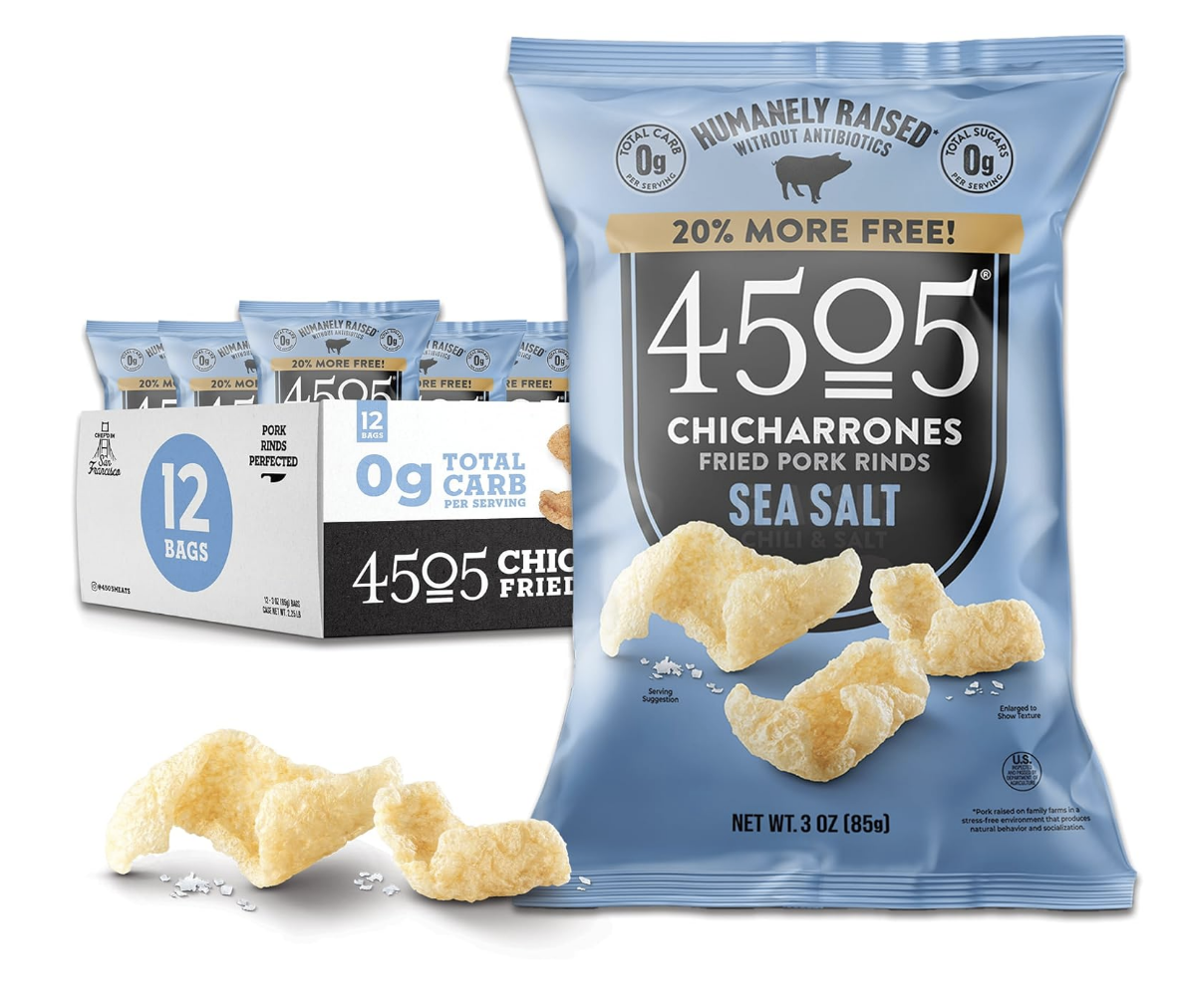 4505 Sea Salt Seasoned Chicharrones, Fried Pork Rinds – Sea Salt Flavored Pork Skins – Low Carb, Gluten-Free, Protein Snack – 3oz (Pack of 12)