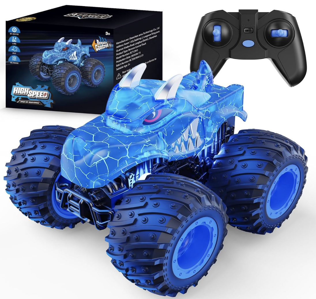 AUUGUU Remote Control Car, 2.4GHz Monster Trucks Toys with Light Spray, Birthday Gift for Kids 3 4 5 6 7 8, All Terrain RC Cars, Toddler Toys for Boys Girls 3+ Year Old